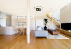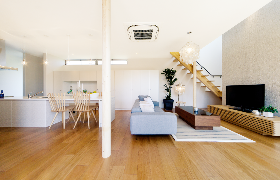 フロア全体を見渡せるリビング・ダイニング。リビング階段やコーナーを設置する事で、家族と過ごす時間を大切にした設計です。