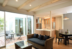 2つの居室とつながるデッキバルコニー。テーブルセットを置いて、自分だけのプライベート空間として楽しむこともできます。